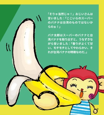 「そりゃ当然じゃ!」おじいさんは 言いました:「ここいらのスーパー のバナナは台湾のものではないか らのぉ!」 バナ太郎はスーパーのバナナと台 湾バナナを取り出すと、うなずきな がら言いました:「香りがよくて甘 い、モチモチとしてやわらかい、そ れが台湾バナナの特徴なのだ。」 9