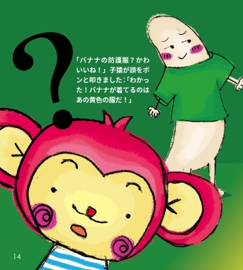 「バナナの防護服?かわ いいね!」子猿が頭をポ ンと叩きました:「わかっ た!バナナが着てるのは あの黄色の服だ!」 14
