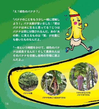 「え?緑色のバナナ?」 「バナナのことをもう少し一緒に理解し よう!」バナ太郎が言いました:「君は バナナは木に生ると思ってる?じつは バナナは草に分類されるんだ。あの『木 の幹』に見えるものは『葉』が何重に も巻いたものなんだよ。 「一年という時間をかけて、緑色のバナ ナは成長するんだ!そして農家の人は そのバナナを収穫し各地の市場に運ぶ んだよ。」 バナナの苗 ツボミから小さな バナナができる バナナの木につぼみができる 16