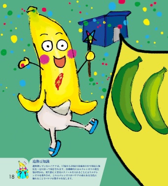 追熟豆知識 通常熟していないバナナは、15度から20度の冷蔵庫の中で温度と湿 度を一定に保って保存されます。冷蔵庫内にはエチレンガスの発生 器が置かれ、発生器に工業用エタノールを入れることによりエチレ 18 ンガスを発生させ、このエチレンガスがバナナの皮にある気孔に 触れることでバナナが熟すのを促します。