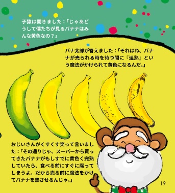 子猿は聞きました:「じゃあど うして僕たちが見るバナナはみ んな黄色なの?」 バナ太郎が答えました:「それはね、バナ ナが売られる時を待つ間に『追熟』とい う魔法がかけられて黄色になるんだ。」 おじいさんがくすくす笑って言いまし た:「その通りじゃ、スーパーから買っ てきたバナナがもしすでに黄色く完熟 していたら、食べる前にすぐに腐って しまうよ。だから売る前に魔法をかけ てバナナを熟させるんじゃ。」 19