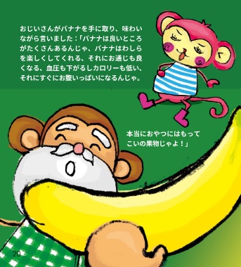 おじいさんがバナナを手に取り、味わい ながら言いました:「バナナは良いところ がたくさんあるんじゃ、バナナはわしら を楽しくしてくれる、それにお通じも良 くなる、血圧も下がるしカロリーも低い、 それにすぐにお腹いっぱいになるんじゃ。 本当におやつにはもって こいの果物じゃよ!」 20