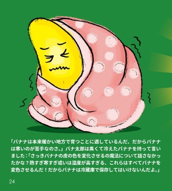 「バナナは本来暖かい地方で育つことに適しているんだ、だからバナナ は寒いのが苦手なのさ。」バナ太郎は黒くて冷えたバナナを持って言い ました:「さっきバナナの皮の色を変化させるの魔法について話さなかっ たかな?熱すぎ寒すぎ或いは湿度が高すぎる、これらはすべてバナナを 変色させるんだ!だからバナナは冷蔵庫で保存してはいけないんだよ。」 24