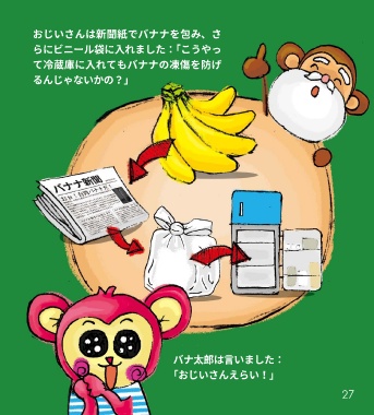 おじいさんは新聞紙でバナナを包み、さ らにビニール袋に入れました:「こうやっ て冷蔵庫に入れてもバナナの凍傷を防げ るんじゃないかの?」 バナ太郎は言いました: 「おじいさんえらい!」 27