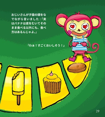 おじいさんが子猿の頭をな でながら言いました:「実 はバナナは皮をむいてその まま食べる以外にも、食べ 方はあるんじゃよ。」 「わぁ!すごくおいしそう!」 29
