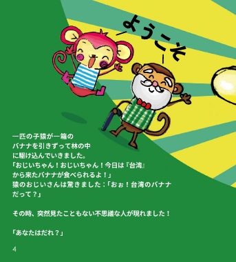 一匹の子猿が一箱の ようこそ バナナを引きずって林の中 に駆け込んでいきました。 「おじいちゃん!おじいちゃん!今日は『台湾』 から来たバナナが食べられるよ!」 猿のおじいさんは驚きました:「おぉ!台湾のバナナ だって?」 その時、突然見たこともない不思議な人が現れました! 「あなたはだれ?」 4