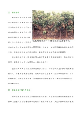 至 於 成 年 大 樹 可 採 用 高 接 法 更 新 予 以 矮 化 , 或 依 分 枝 數 之 多 寡 採 疏 刪 兼 短