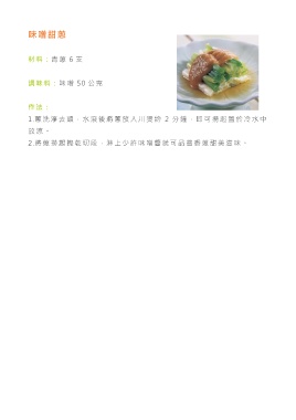 味噌甜蔥 材料:青蔥 6 支 調味料:味噌 50 公克 作法: 1.蔥洗淨去頭,水滾後將蔥放入川燙約 2 分鐘,即可撈起置於冷水中 放涼。 2.將蔥撈起擦乾切段,淋上少許味噌醬就可品嘗香蔥甜美滋味。