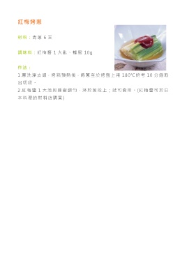 紅梅烤蔥 材料:青蔥 6 支 調味料:紅梅醬 1 大匙、蜂蜜 10g 作法: 1.蔥洗淨去頭,烤箱預熱後,將蔥至於烤盤上用 180℃約考 10 分鐘取 出切段。 2.紅梅醬 1 大池與蜂蜜調勻,淋於蔥段上;就可食用。(紅梅醬可於日 本料理的材料店購買)