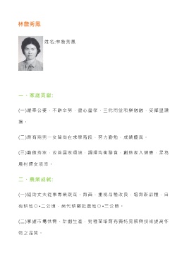 林詹秀鳳 姓 名 :林詹秀鳳 一、家庭貢獻: (一)是奉公婆,不辭辛勞,盡心盡孝,三代同堂和樂融融,受鄰里讚 揚 。 (二)育有兩男一女皆尚在求學階段,努力勤勉,成績優異。 (三)勤儉持家,改善居家環境,調理均衡膳食,創造家人健康,足為 農村婦女表率。 二、農業成就: (一)協助丈夫從事專業蔬菜、育苗,重視品種改良,培育新品種,自 有 耕 地 ○ • 二公頃,尚代耕鄰近農地 ○ • 三公頃。 (二)掌握市場供需、計劃生產,對種苗培育有獨特見解與技術提高作 物之品質。