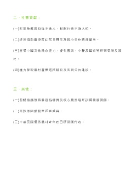 二、社會貢獻: (一)村里急難救助從不後人,默默行善不為人知。 (二)經常捐助南投育幼院日用品及國小美化環境蘭苗。 (三)宣場中國文化熱心盡力,提供書法、中醫及國術等研習場所及器 材 。 (四)極力爭取農村產業道路舖設及各項公共建設。 三、其他: (一)四健推廣教育義務指導員及核心農民培育訓練義務講師。 (二)南投縣園藝協會評審委 員 。 (三)中華民國優秀農村青年赴日研習團代表。