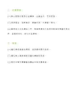 二、社會貢獻: (一)熱心服務社區及公益事業,出錢出力,任勞任怨。 (二)救濟貧苦,為民義診、樂善好施、年捐獻十萬元。 (三)重視地方文化建設工作,負責供應地方各項活動場所佈置所需花 卉 , 至 協助美化,綠化社區環境。 三、其他: (一)擔任學校義務指導員,協助農村青年創業。 (二)擔任核心農民講師及蘭花產銷班班長。 (三)曾任中華民國蘭藝協會台中縣支會委員。