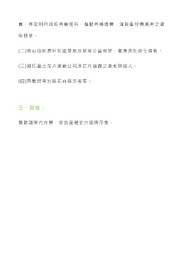 員,有效利用回收有機肥料,推動有機農業,灌輸畜牧業應有之環 保觀念。 (二)熱心協助農村社區發展及慈善公益事業,響應美化綠化運動。 (三)擔任臺北花卉產銷公司及花卉協會之產地聯絡人。 (四)帶動屏東地區花卉栽培風氣。 三、其他: 贊助國際花卉展,塑造臺灣花卉國際形象。