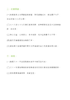 二、社會貢獻: (一)免償提供土地開闢產業道路,降低運輸成本,受益農戶九戶, 受益面積六 ○ • 五公頃。 (二)七十六至七十九年擔任鄰長期間,經常修剪社區花木及清掃道 路、排水溝。 (三)熱心公益,心懷愛心,多次捐款,每次金額數千元不等。 (四)擔任四健會義務指導員三年。 (五)接持第六屆國際農村青年世界會議代表三名美國草根大使。 三 、 其他: (一)獲選八十一年度國際農村青年中韓互訪代表。 (二)八十一年度指導會員參加縣級技術交換大會技能競賽獲殿軍。 (三)協助農業推廣教育,貢獻至鉅。
