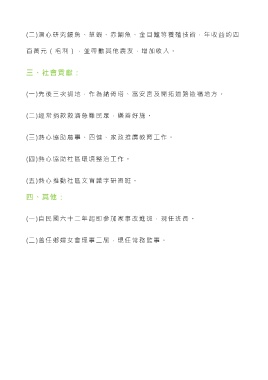 (二)潛心研究鰻魚、草蝦、赤鯛魚、金目鱸等養殖技術,年收益約四 百萬元(毛利),並帶動其他農友,增加收入。 三、社會貢獻: (一)先後三次捐地,作為納骨塔、富安宮及開拓道路造福地方。 (二)經常捐款救濟急難民眾,樂善好施。 (三)熱心協助農事、四健、家政推廣教育工作。 (四)熱心協助社區環境整治工作。 (五)熱心推動社區文盲識字研習班。 四、其他: (一)自民國六十二年起即參加家事改進班,現任班長。 (二)曾任鄉婦女會理事二屆,現任常務監事。