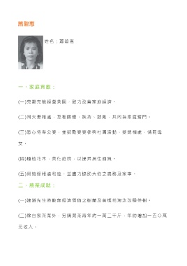 蕭碧惠 姓名:蕭碧惠 一、家庭貢獻: (一)克勤克檢經營茶園,致力改善家庭經濟。 (二)同夫妻相處,互相關懷、扶持、鼓勵,共同為家庭奮鬥。 (三)悉心侍奉公婆,並鼓勵婆婆參與社團活動,婆媳相處,情同母 女 。 (四)種植花木,美化庭院,以提昇居住品質。 (五)與妯娌相處和睦、並盡力協助大伯之農務及家事。 二、農業成就: (一)建議先生將較無經濟價值之樹蘭及黃梔花淘汰改種茶樹。 (二)除自家茶葉外,另購買茶青年約一萬二千斤,年約增加一五 ○萬 元收入。