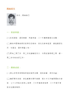 周高採玉 姓名:周高採玉 一、家庭貢獻: (一)刻苦耐勞,誠信篤實,克盡孝道,八十年獲模範婦女表揚。 (二)秉持中國傳統婦女任勞任怨精神,與先生胼手胝足,創造富足生 活,在臺北、臺中購置土地。 (三)育有二男三女,除二女就讀靜宜女大,次男就讀黎明工專,餘一 男二女均有良好工作。 二、農業成就: (一)潛心研究茶葉種植管理試植新品種,提高產量,增加收益。 (二)精研製茶技術,參加龍壽茶製作競賽,獲七十九年春季優良茶參 等,七十九年製茶技術二等獎,八十年春季參等獎,八十年獅子會 製茶比賽參等獎。