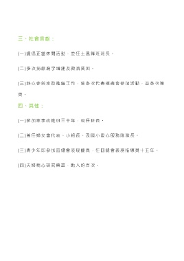 三、社會貢獻: (一)提倡正當休閒活動,並任土風舞班班長。 (二)多次捐獻廟宇增建及救濟貧困。 (三)熱心參與家政推廣工作,曾多次代表鄉農會參加活動,並多次獲 獎 。 四、其他: (一)參加家事改進班三十年,現任班長。 (二)曾任婦女會代表、小組長、及國小愛心服務隊隊長。 (三)青少年即參加四健會表現優異,任四健會義務指導員十五年。 (四)夫婦精心研究藥草,助人約百次。