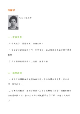 張麗琴 姓名:張麗琴 一、家庭貢獻: (一)相夫教子,勤撿持家,皆有口碑。 (二)協助丈夫從事園圃工作,任勞任怨,是以家庭與農業並重之標準 農 家 。 (三)具中國傳統農家婦女之美德,鄰里稱譽。 二、農業成就: (一)鄉應政府種植高經濟價值農作物,引進多種庭園造景,花木栽 培,普受歡迎。 (二)設置栽培棚室,並精心研究木瓜花(長壽梅)栽培,獨創以修剪 技術調整開花期,使木瓜花開花期能提早亦可延遲,供應期大為增 加 。
