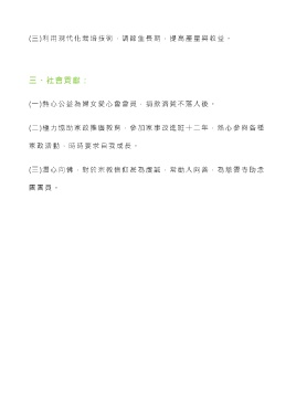 (三)利用現代化栽培技術,調節生長期,提高產量與收益。 三、社會貢獻: (一)熱心公益為婦女愛心會會員,捐款濟貧不落人後。 (二)極力協助家政推廣教育,參加家事改進班十二年,熱心參與各種 家政活動,時時要求自我成長。 (三)潛心向佛,對於宗教信仰甚為虔誠,常勸人向善,為慈雲寺助念 團團員。