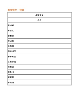 農家婦女一覽表 農家婦女 姓 名 黃洪綬 鄭雪紅 蕭碧惠 林瑞紛 林燕隨 周高採玉 李林素玉 王黃彩信 陳美滋 陳秋梅 張麗琴 林美續