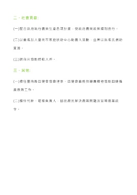 二、社會貢獻: (一)配合政府執行農業生產各項計畫,使政府農業政策順利推行。 (二)以義名加入臺南市家庭扶助中心助養人活動,並常以無名氏捐助 貧 困 。 (三)捐白米協助低收入戶。 三、其他: (一)擔任臺南縣四健會協會理事、四健會義務指導員積極協助四健推 廣教育工作。 (二)擔任代耕、乾燥負責人,協助農民解決農業問題及宣導農業政 令 。