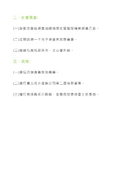 二、社會貢獻: (一)發動並籌措經費捐贈埔里社區建設精神保壘乙座。 (二)定期認捐一千元予埔里民眾慈善會。 (三)組織花農拓展百合、文心蘭外銷。 三、其他: (一)擔任四健會義務指導員。 (二)擔任臺北花卉產銷公司第二屆常務董事。 (三)擔任南投縣花卉園藝、急難救助委員會主任委員。