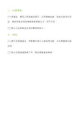 二、社會貢獻: (一)其溫室、網室之設施栽培蔬茶,於該鄉屬首創,使栽培者 群起仿 效,進而帶動高品質精緻農業經營方式,功不可沒。 (二)熱心公益對鄰里各項活動參與熱心。 三、其他: (一)擔任四健會義指,帶動農村青年正當娛樂活動,並指導農業知識 技 術 。 (二)熱心四健推廣教育工作,協助農會擴展業務。
