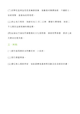 (二)受聘社區衛生促進委員會委員,推動農村醫療服務,不遺餘力。 敬老尊賢,當選為敬老楷模。 (三)熱心地方教育、捐獻校地 ○ ‧ 四二公頃,關懷社會傷殘,捐款二 千元贊助全國殘障年會經費。 (四)出錢出力協助四健會農村文化服務 隊,舉辦勞軍晚會,捐款七萬 元贊助社區活動。 三、其他: (一)歷任嘉南農田水利會班長、小組長。 (二)現任農會理事。 (三)擔任核心農民幹部,協助農業推廣教育活動及各項講習訓練。