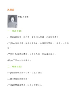 洪翠姬 姓 名 :洪翠姬 一、家庭貢獻: (一)婚前對製茶一竅不通,婚後用心學習,已成製茶高手。 (二)盡心侍奉公婆,妯娌相處融洽,共同管理茶園,一起參加成長活 動 。 (三)美化改善居住環境,並提供民宿、茶食增加收入。 (四)育二男一女均就學中。 二、農業成就: (一)親自管理茶園十公頃,並親自製茶。 (二)多次獲製茶技術獎。 (三)精研茶藝及茶食,以增加家庭收入。