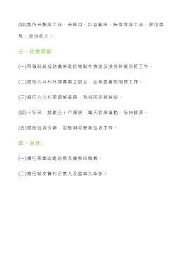 (四)製作米類加工品、米篩目、紅豆鹼粽、味增等加工品,參加農 展,增加收入。 三、社會貢獻: (一)帶領班員協助農業改良場製作食譜及接持外賓烹飪工作。 (二)協助九斗村休閒農場之設立,並負責養飲服務工作。 (三)擔任九斗村里調解委員,為村民排難解紛。 (四)十年來,鼓勵五十戶鄰居,每天從事運動,保持健康。 (五)協助垃圾分類,定點回收資源垃圾工作。 四、其他: (一)擔任家事改進班長及義務指導員。 (二)擔任婦女會村召集人及監事九年多。