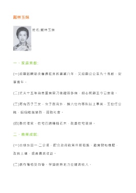 戴林玉妹 姓 名 :戴林玉妹 一、家庭貢獻: (一)照顧因關節炎癱瘓在床的婆婆八年,又照顧公公至九十高齡,安 享晚年。 (二)丈夫十五年前患重病開刀後體弱多病,細心照顧至今已康復。 (三)育有四子三女,次子務商外,餘六位均專科以上畢業,五位任公 職,個個敬業樂群,服務社會。 (四)勤於理家,住宅四週種植花木,改善住宅環境。 二、農業成就: (一)自耕水田一‧二公頃,配合政府政策示範稻穀、雞糞製有機肥, 改良土壤,提高農業收益。 (二)裹作種植筊白筍、芋頭維持地力並提高收入。