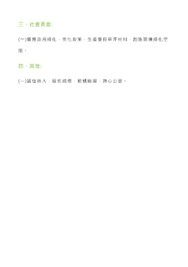 三、社會貢獻: (一)響應政府綠化,美化政策,生產優良草坪材料,創造環境綠化空 間 。 四、其他: (一)誠信待人,個性純樸,敦親睦鄰,熱心公益。
