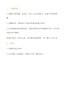 二、社會貢獻: (一)關懷社區環境,對美化、綠化工作不遺餘力,發動村民整理環 境 。 (二)樂善好施,捐助貧戶及廟宇修建為鄰里之表率。 (三)自費舉辦各項娛樂活動,增進與農民契作各種果茶作物,年社會 和諧及地方團結。 (四)設立農村小型加工廠,增加農民就業機會,防止農村人口外流。 三、其他: (一)農事研究班班長。 (二)自幼罹小兒麻痺症,身殘心不殘,奮鬥有成。