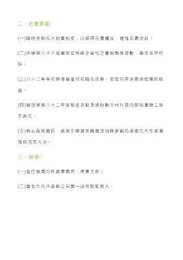 二、社會貢獻: (一)積極推動花卉拍賣制度,以保障花農權益,增加花農收益。 (二)承辦第六十八屆國際合作節全省性之慶祝觀摩活動,頗受各界好 評 。 (三)八十二年年初辦理省產切花贈花活動,促進花卉消費增進農民收 益 。 (四)協助辦理八十二年度敬老活動及捐助聯合村社區合安宮重建工程 五萬元。 (五)熱心服務農民,義務引導農業團體及班隊參觀后里鄉花卉生產概 況約五百人次。 三、其他: (一)曾任墩南合作農場場長,理事主席。 (二)臺北市花卉產銷公司第一屈常駐監 察人。