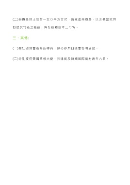 (二)無償提供土地計一五 ○平方合尺,拓寬產業道路,以方便當地其 他農友竹筍之搬運,降低運輸成本二 ○% 。 三、其他: (一)擔任四健會義務指導員,熱心參與四健會各項活動。 (二)分別接待美國草根大使、菲律賓及韓國國際農村青年六名。