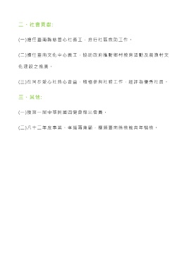 二、社會貢獻: (一)擔任臺南縣慈善心社義工,推行社區救助工作。 (二)擔任臺南文化中心義工,協助政府推動鄉村教育活動及農漁村文 化建設之推廣。 (三)在同步愛心社熱心合益,積極參與社務工作,經評為優秀社員。 三、其他: (一)獲第一屆中華民國四健會傑出會員。 (二)八十二年度事業、孝道兩兼顧,獲頒臺南縣模範青年楷模。