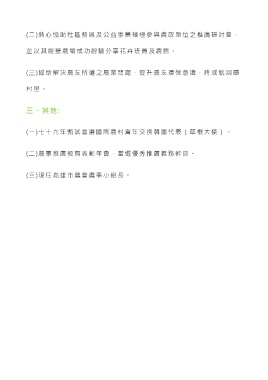 (二)熱心協助社區務展及公益事業積極參與農政單位之推廣研討會, 並以其經營農場成功經驗分享花卉班員及農民。 (三)協 助 解決農友所遭之農業問題,提升農友環保意識,將成就回饋 村 里 。 三、其他: (一)七十九年甄試當選國際農村青年交換韓國代表(草根大使)。 (二)農事推廣教育表彰年會,當選優秀推廣義務幹部。 (三)現任高雄市農會農事小組長。