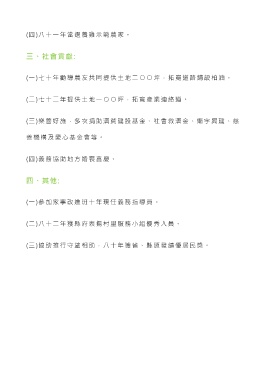 (四)八十一年當選養雞示範農家。 三、社會貢獻: (一)七十年勸導農友共同提供土地二 ○ ○ 坪,拓寬道路鋪設柏油。 (二)七十二年提供土地一 ○ ○ 坪,拓寬產業連絡道。 (三)樂善好施,多次捐助濟貧建設基金、社會救濟金、廟宇興建、慈 善機構及愛心基金會等。 (四)義務協助地方婚喪喜慶。 四、其他: (一)參加家事改進班十年現任義務指導員。 (二)八十二年獲縣府表揚村里服務小組優秀人員。 (三)協助推行守望相助,八十年獲省、縣頒發績優居民獎。