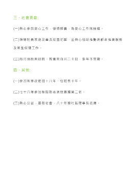 三、社會貢獻: (一)熱心參與愛心工作,慷慨解囊,為愛心工作隊楷模。 (二)領導班員家庭改善及設置花園,並熱心協助推動高齡者推廣服務 及衛生保健工作。 (三)每月捐助育幼院、教養院白米二十包,多年不間斷。 四、其他: (一)參加家事改進班十八年,任班長十年。 (二)七十八年參加縣服務表演競賽獲第二名。 (三)熱心公益,服務社會,八十年獲社區理事長表揚。