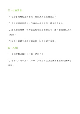 三、社會貢獻: (一)協助爭取農村產業道路,便於農友運銷農產品。 (二)協助整修巷道排水,疏通村內排水設備,減少蚊虫滋生。 (三)組織環保媽媽,輔導農民垃圾分類資源回收,維持環境衛生及美 化庭院。 (四)輔導社區婦女參與研習活動,以協助婦女成長。 四、其他: (一)參加家事改進班十三年,現任班長。 (二)七十八、七十九、八十一、八十三年度協助農業推廣有功獲農會 頒 獎 。