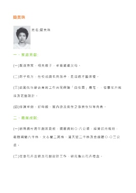 簡美珠 姓 名 :簡美珠 一、家庭貢獻: (一)賢淑持家,相夫教子,孝順婆婆父母。 (二)育子有方,在校成績名列前矛,且品德才藝兼優。 (三)鼓勵先生辭去高薪工作共同興建「自在園」農宅,,從事花卉栽 培及花藝設計。 (四)伴演孝媳、好母親、賢內助及先生之事業伙伴等角色。 二、農業成就: (一)辦理農村青年創業貸款,購置農地 ○ ‧ 八公頃,經營花卉栽培, 栽種國蘭六千株、文心蘭二萬株、滿天星二千株及金線蓮 ○‧○三 公 頃 。 (二)從事花卉直銷及花藝設計工作,研究推出花卉禮盒。