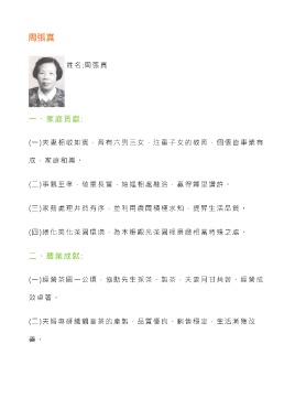 周張真 姓 名 :周張真 一、家庭貢獻: (一)夫妻相敬如賓,育有六男三女,注重子女的教育,個個皆事業有 成,家庭和樂。 (二)事親至孝,敬重長輩,妯娌相處融洽,贏得鄰里讚許。 (三)家務處理井然有序,並利用農閒積極求知,提昇生活品質。 (四)綠化美化茶園環境,為木柵觀光茶園裡景緻相當特殊之處。 二、農業成就: (一)經營茶園一公頃,協助先生採茶、製茶,夫妻同甘共苦、經營成 效卓著。 (二)夫婦專研鐵觀音茶的產製,品質優良、銷售穩定,生活漸獲改 善 。