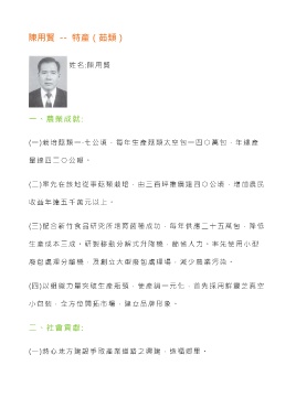 (二)率先在該地從事菇類栽培,由三百坪推廣達四 ○公頃,增加農民