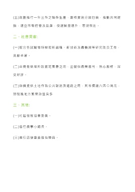 (五)規劃推行一年三作之輪作生產,嚴格實施分級包裝,推動共同運 銷,建立市場信譽及品牌,使運銷量遞升,表現傑出。 二、社會貢獻: (一)配合各試驗場所辦理新品種、新技術及農機具等研究改良工作, 貢獻卓著。 (二)自費提供場所設置班集會之用,並提供農業書刊,熱心服務,深 受好評。 (三)無償提供土地作為公共設施及道路之用,其市價達六四 ○萬元, 對促進地方繁榮助益良多 三、其他: (一)社區發展協會委員。 (二)曾任農事小組長。 (三)擔任四健會義務指導員。