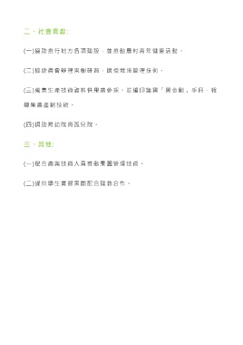 二、社會貢獻: (一)協助推行地方各項建設,並推動農村青年健康活動。 (二)協助農會辦理果樹研習,講授栽培管理技術。 (三)蒐集生產技術資料供果農參採。並編印蓮霧「黑金剛」手冊,報 導果農產銷技術。 (四)捐助育幼院與孤兒院。 三、其他: (一)配合農業技術人員推動果園管理技術。 (二)提供學生實習果園配合建教合作。