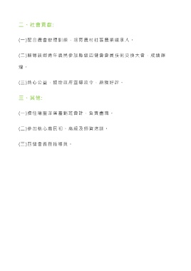二、社會貢獻: (一)配合農會辦理訓 練,培育農村社區農業繼承人。 (二)輔導該鄉青年農民參加縣級四健會會員技術交換大會,成績輝 煌 。 (三)熱心公益,協助政府宣導政令,頗獲好評。 三、其他: (一)擔任瑞里茶葉產銷班會計,負責盡職。 (二)參加核心農民初、高級及師資培訓。 (三)四健會義務指導員。