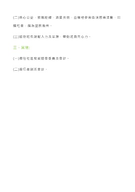 (二)熱心公益,敦親睦鄰,濟貧扶弱,並積極參與各項慈善活動,回 饋社會,頗為里民推崇。 (三)協助班長調配人力及菜源,帶動班員向心力。 三、其他: (一)擔任社區發展協會委員及會計。 (二)擔任產銷班會計。
