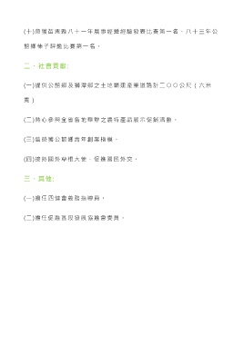 (十)榮獲苗栗縣八十一年農事經營經驗發表比賽第一名、八十三年公 館鄉柿子評鑑比賽第一名。 二、社會貢獻: (一)提供公館鄉及獅潭鄉之土地闢建產業道路計二 ○ ○ 公尺(六米 寬 ) (二)熱心參與全省各地舉辦之農特產品展示促銷活動。 (三)曾榮獲公館鄉青年創業楷模。 (四)接持國外草根大使,促進國民外交。 三、其他: (一)擔任四健會義務指導員。 (二)擔任促進區段發展協進會委員。