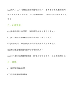 (五)為八十三年毛豬生產成本降低示範戶,提供養豬農民觀摩場所, 提升豬場經營管理效率,並增進養豬新知;協助記帳分析生產成本 工 作 。 二、社會貢獻: (一)參與各項公益活動,協助社區義務消毒排水溝等。 (二)常以無名氏參與孤兒院救濟活動,義行可風。 (三)救濟貧困,樂善好施八十四年獲鄉長及村里獎狀。 (四)贊助長春俱樂部獲頒敬老尊賢獎狀。 (五)接待香港養豬協會成員,除彼此技術砌磋外,並促進國民外交。 三、其他: (一)國際青商會會員。 (二)四健會義務指導員。